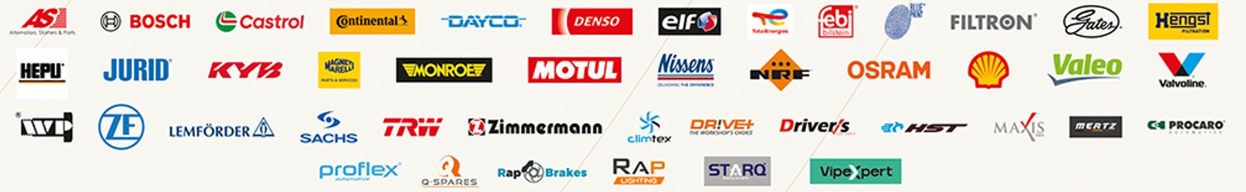 AUTO STARTER, BOSCH, CASTROL, CONTI /ROZRZĄD I ŁOŻYSKA/, DAYCO, DENSO, ELF TOTAL, FEBI BLUE PRINT, FILTRON, GATES, HENGST, HEPU, JURID, KYB, MAGNETI MARELLI, MONROE, MOTUL, NISSENS, NRF, OSRAM NEOLUX, SHELL, VALEO, VALVOLINE, WP, ZF (TRW, SACHS, LEMFORDER), ZIMMERMANN, CLIMTEX, DRIVE+, DRIVER’S , HST NARZĘDZIA, MAXIS , MERTZ, NARZĘDZIA HST, PROCARO, PROFLEX, QSPARES, RAP BRAKES, RAP LIGHTING, STARQ, VIPEXPERT